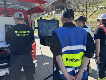 Im Einsatz: Die Polizei und Bergrettung mit mehreren Einsatzkräften, die Feuerwehr Nofels mit dem Einsatzleitfahrzeug und 4 Einsatzkräften, unter anderem zwei Drohnen- Piloten.